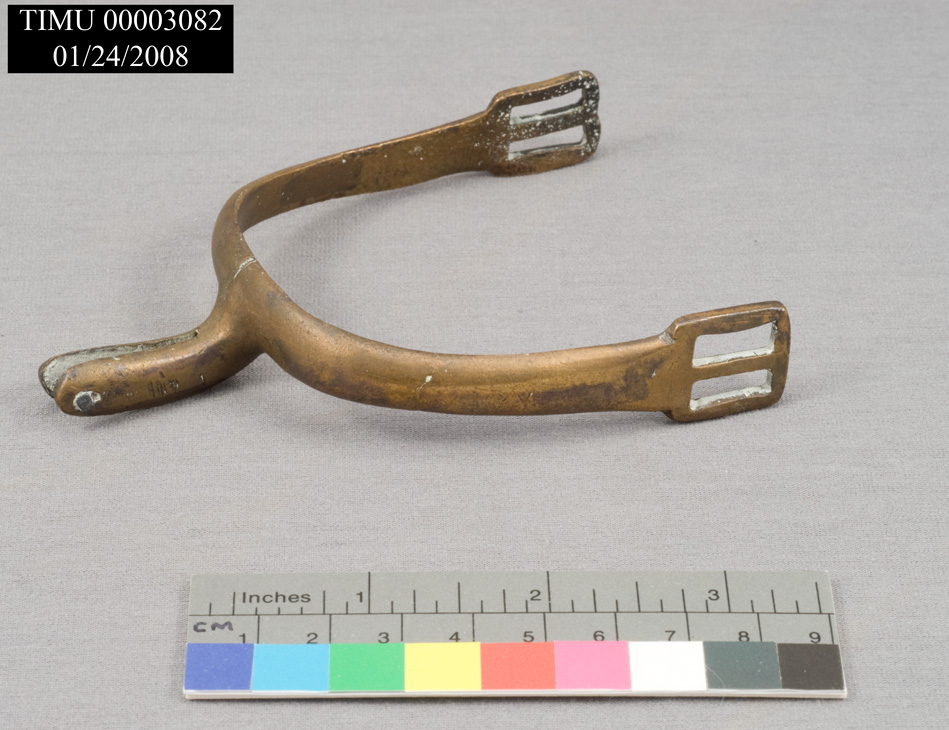 Brass English boot spur. Molded from single piece of metal, but has 2 sections.<CRThe metal was flattened then bent into a horseshoe shape at base, & a narrow v-shaped sect<CRion sitting perpendicular to the base at its top center. Each end of base square 1.8x1.8<CRw/2 rectangular holes cut into it. Each side of top has small hole w/remains of nail or sc<CRrew. Somewhat tarnished w/nick at top of base, but otherwise in good condition.