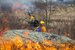 Two fire fighters can been seen through the heat of the fire as they monitor the prescribed fire. There is fire in front of a large boulder and the fire fighters are behind the boulder.