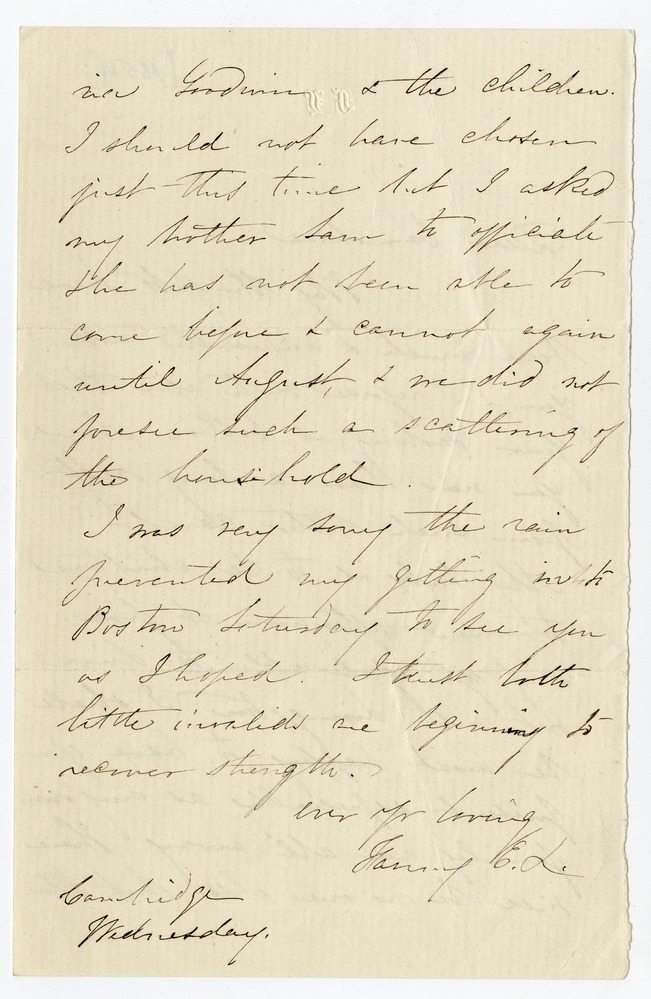 My thought have been much & anxiously with you, & I rejoice with you that your darling is better. May you now have a long rest form such bitter cares! My baby is to be christened tomorrow afternoon at five, & if you feel able to drive out with Livingston I shall be most happy to have you present, especially as my own family are all away. There will be no one else but Ma [p. 2] ria Goodwin & the children. I should not have chosen just this time but I asked my brother Sam to officiate & he has not been able to come before & cannot again until August, & we did not foresee such a scattering of the household.