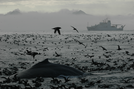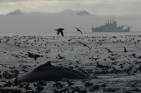 A humpback whale back surrounded by murres and other seabirds in the ocean with a large ship in the background.