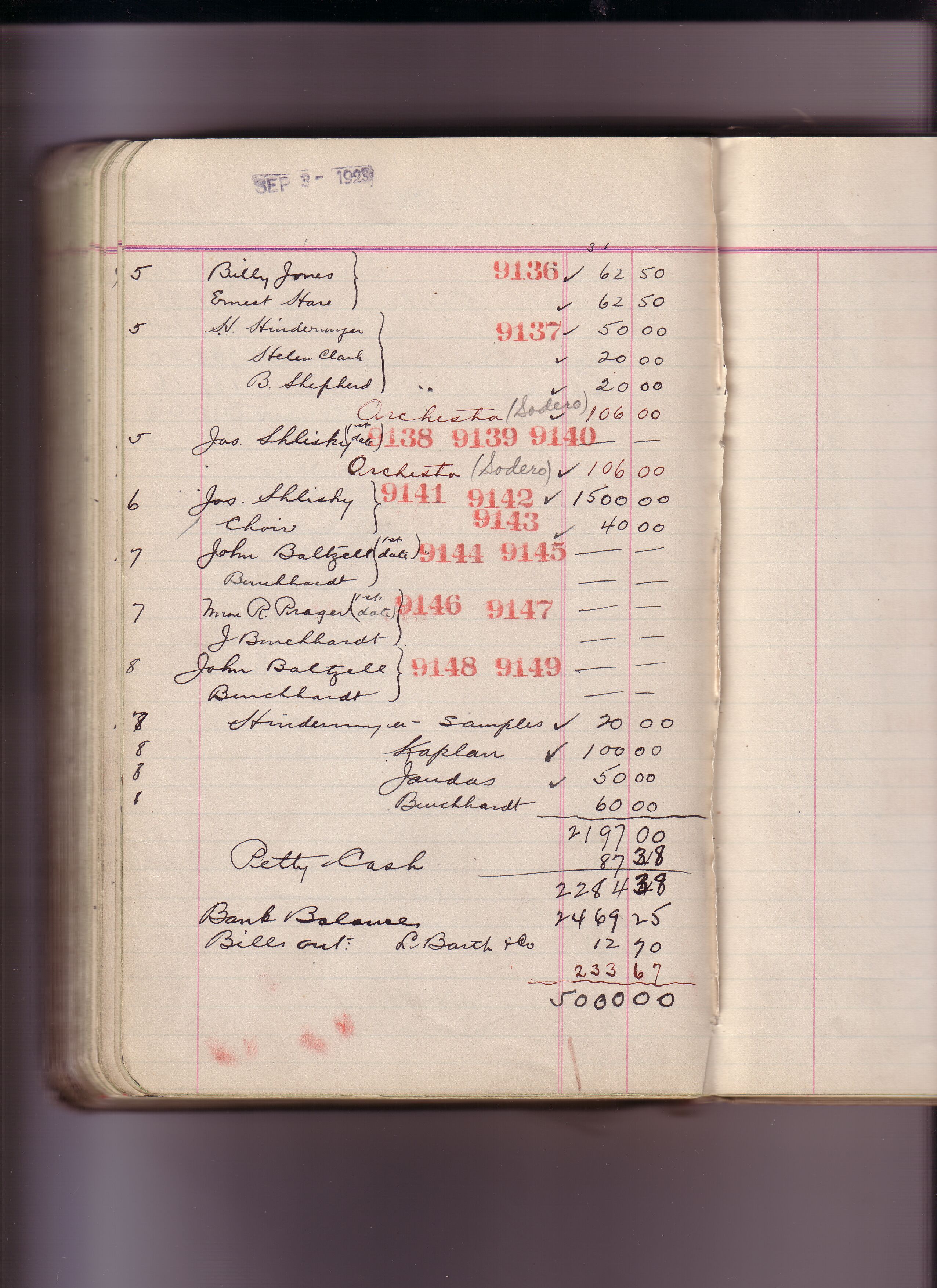 Thomas Edison's New York City Recording Studio Cash Book 17 (of 21), Image 232 (of 244). (Notebook #: PN-21-01-01, NPS catalog #: EDIS 1428), This book documents Diamond Disc matrices 7713 – 9183, expenditures for recording artist fees and other payments authorized by studio manager Walter H. Miller from January 03, 1921 – September 29, 1923. Digitally scanned December 2004 through July 2005 at resolution 300 dpi, 24 bit.