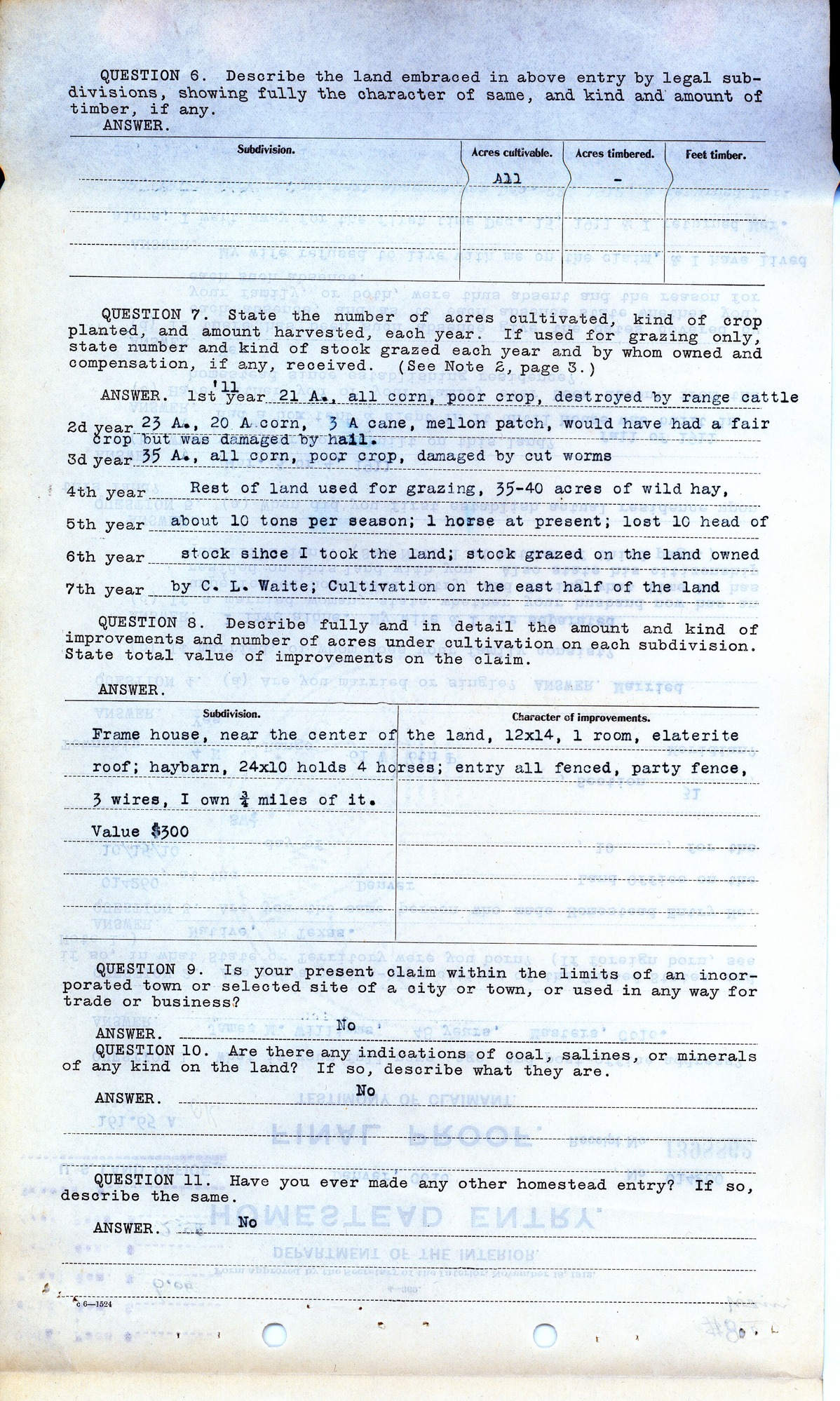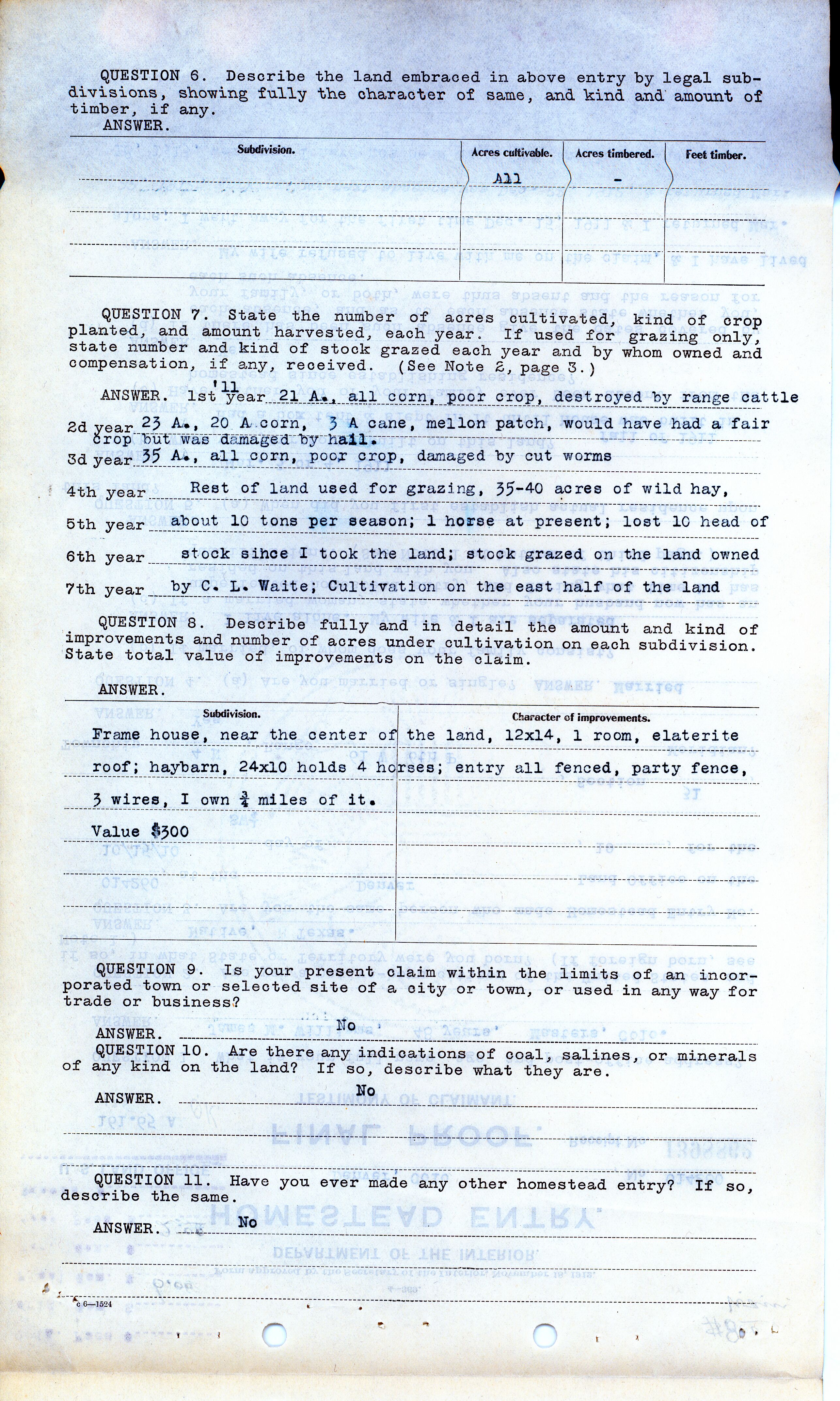 QUESTION 7. State the number of acres cultivated, kind of crop planted, and amount harvested, each year. If used for grazing only, state number and kind of stock grazed each year and by whom owned and compensation, if any, received. (See Note 2, page 3.)