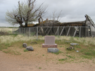Dilapidated wooden building surrounded by chain-link fence. Stone marker sits outside fence.