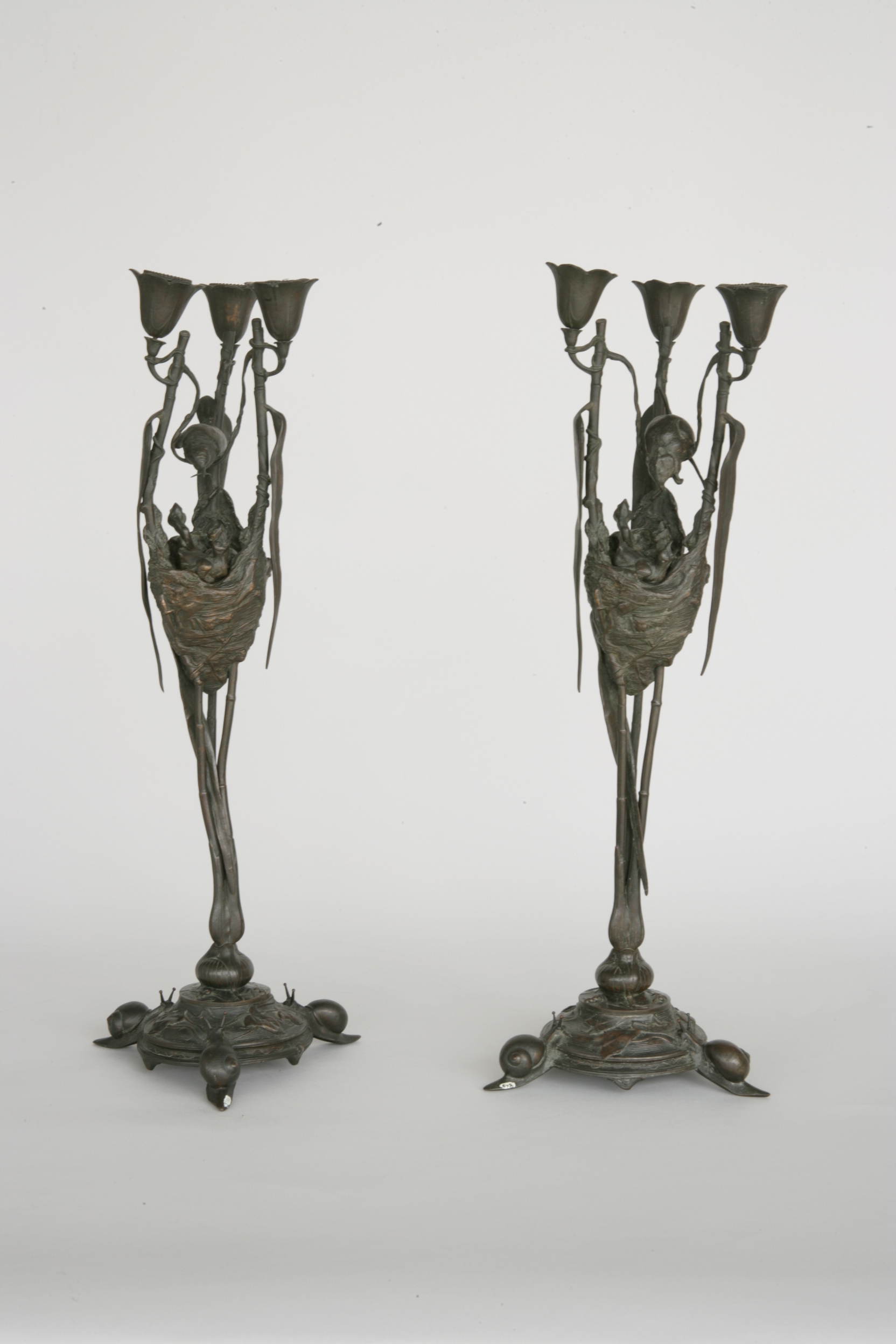 These candelabrum (c. 1850-1868) designed by August Nicholas Cain depict birds' nests, mice, and snails. They are believed to have been originally purchased for Theodore Roosevelt parents' home on West 57th Street in Manhattan. They are located on the mantle in the Library in the Theodore Roosevelt Home.