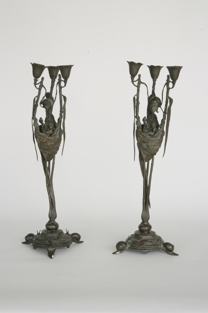 A pair of tall bronze candlesticks. The base of the candlesticks are composed of carved snails that act as feet. The shaft of the candlesticks are composed of different reeds that supports a nest. Inside the nest are baby birds. There are three flower cups that extend above the nest.