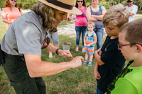 A ranger showing children how to use a gee-haw whimmy diddle, a traditional children's toy, at the Ozark Folklife Festival.