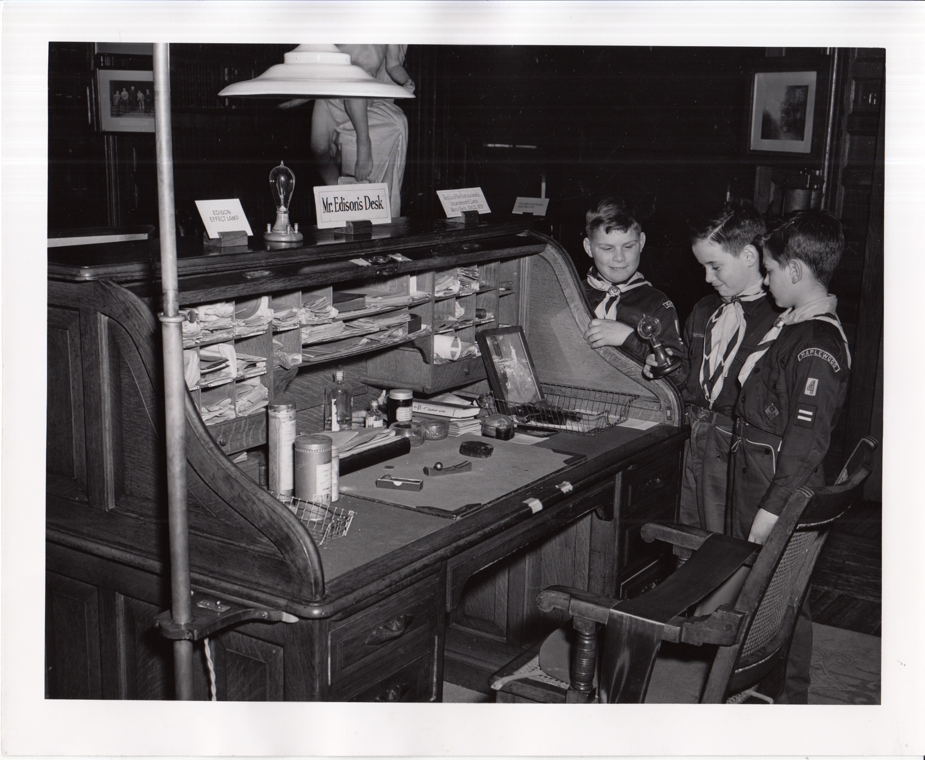 Cub scouts examining replica of incandescent lamp near Thomas Edison's desk in the library of Building 5.