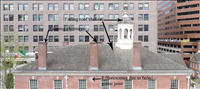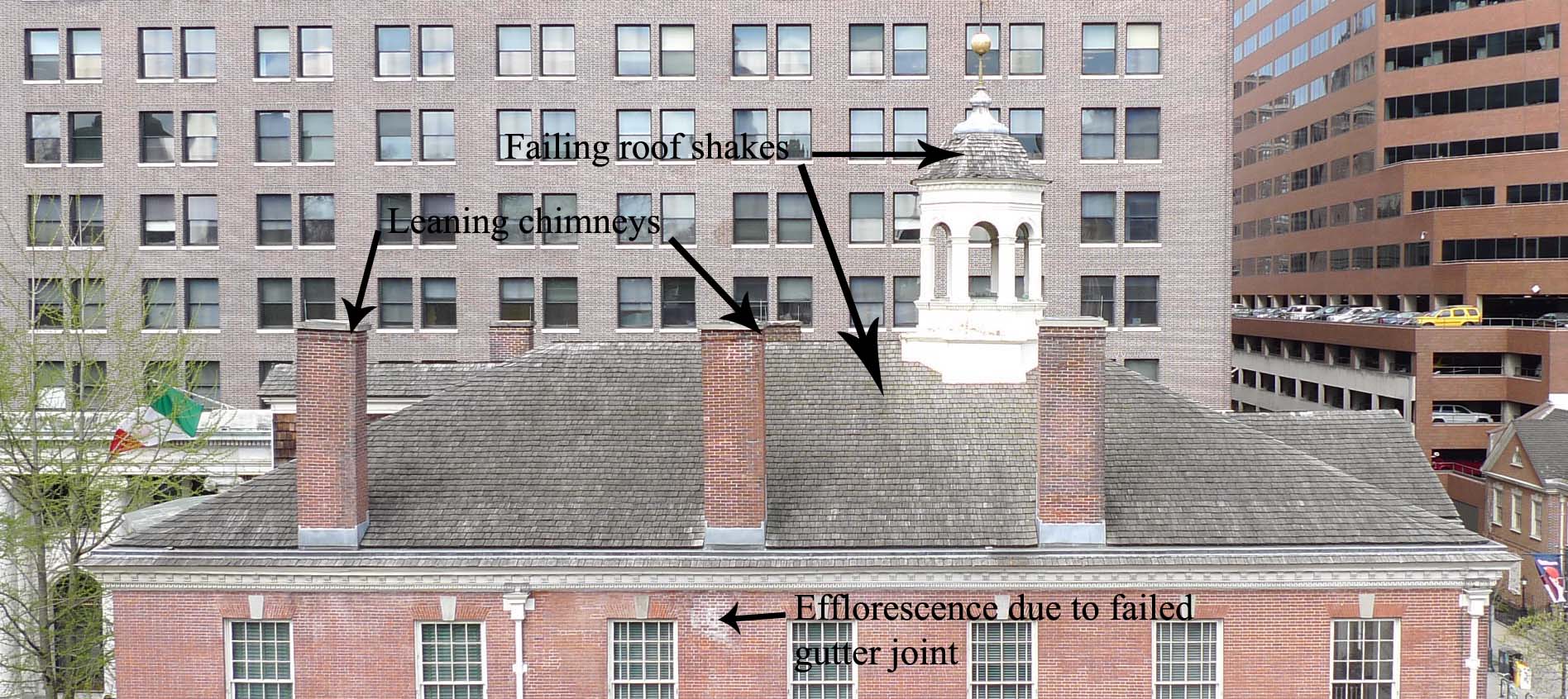 This is an overall view of Congress Hall roof looking from the east. Arrows point ot the major areas of repair issues. These issues impact the overall visitors' experience because of the sites importance and location.