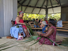 A demonstrator shows two visitors how to weave with coconut leaves at an annual Cultural Festival.