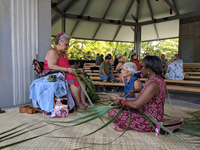 A demonstrator shows two visitors how to weave with coconut leaves in the amphitheater.