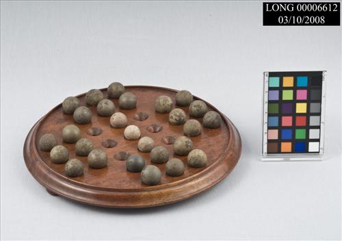 ROUND MAHOGANY SOLITAIRE BOARD, MOLDED AND BEADED AROUND SIDES. TOP OF BOARD PERFORATED W/ 33 HOLES. BOARD HAS 3 SMALL, FLATTENED-BALL FEET AND IS FITTED W/ 27 CLAY MARBLES, 3 SMALLER THAN THE REST.