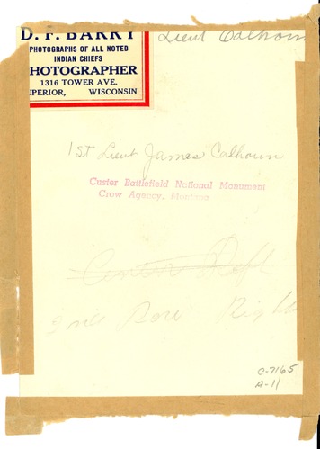 LIBI_00011_07165; A black-and-white photograph of 1st lieutenant James Calhoun in dress uniform, in full bust view; D. F. Barry copyrighted; by O.S. Goff 1873-1876. Glued paper on reverse. Barry label on reverse. Calhoun commanded Co. I. And was killed with Custer battalion. Calhoun was married to General Custer's sister, Margaret.; PRINT, PHOTOGRAPHIC; Courtesy of the National Park Service, Little Bighorn Battlefield National Monument, LIBI_00011_07165, Orlando Scott Goff and D. F. Barry, "First Lieutenant, James Calhoun," circa 1873-1876
