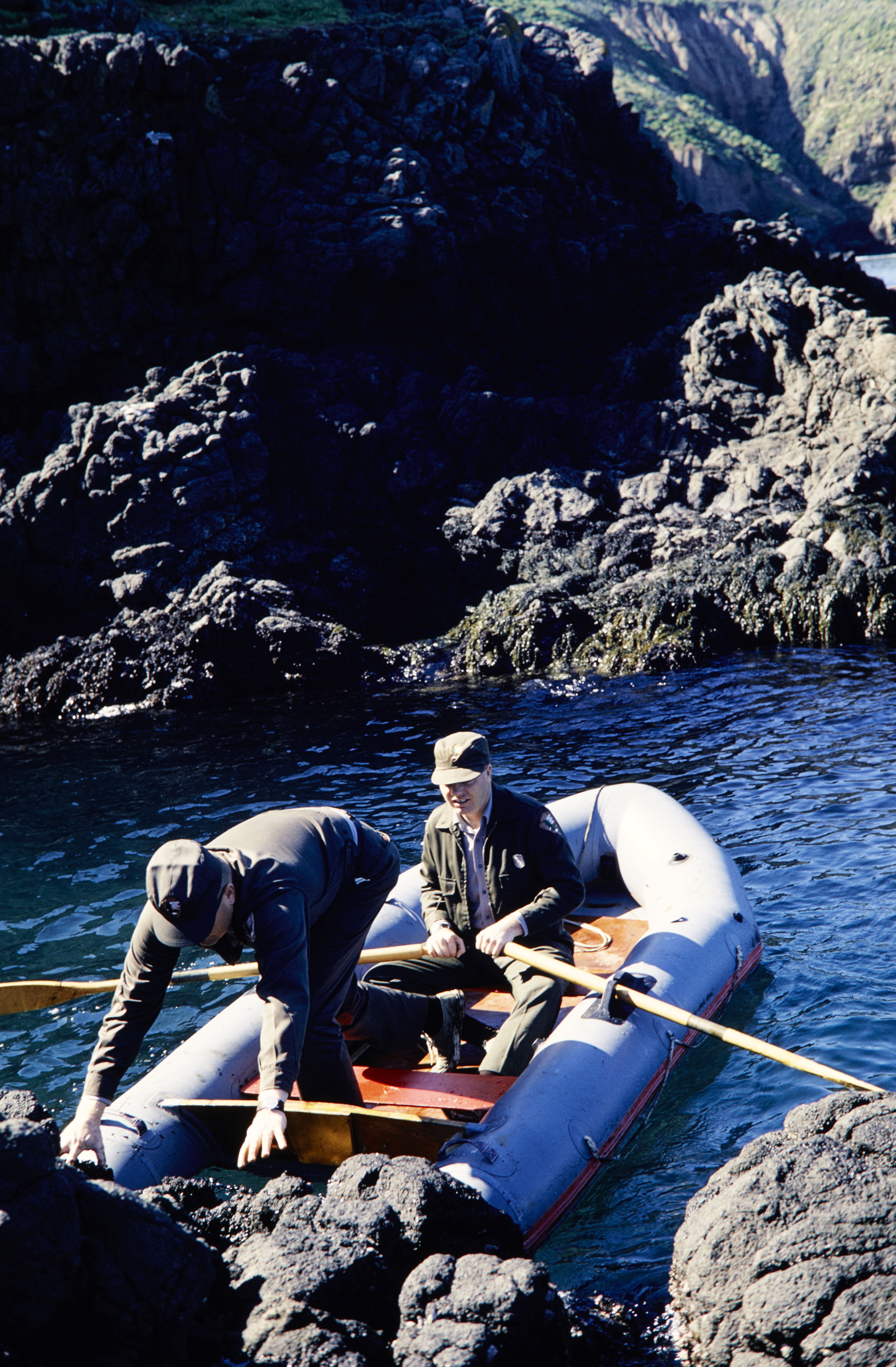 Two NPS employees rowing an inflatable boat in Channel Islands National Park.