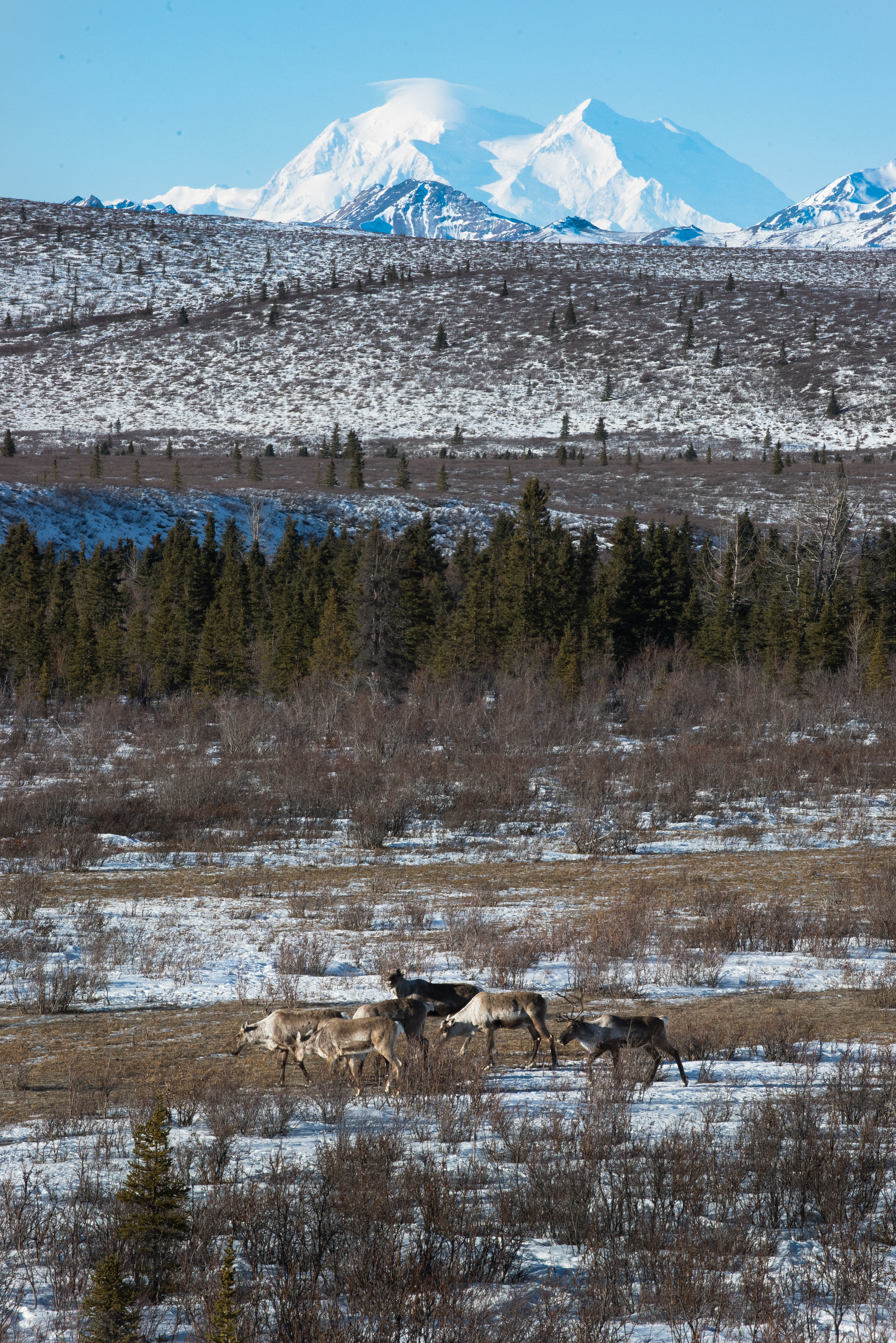 A small band of caribou in the spring, with Mount McKinley in the background