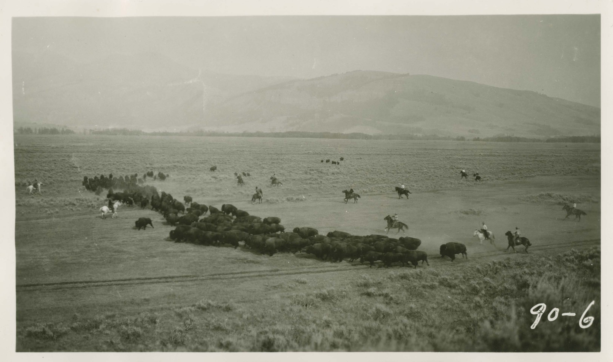 Buffalo [Bison] Stampede, Daum. Locality: Yellowstone National Park. Negative #: 90-6. Location of Negative: Yellowstone National Park. [The date and location come from the reverse of the envelope for this negative number.].