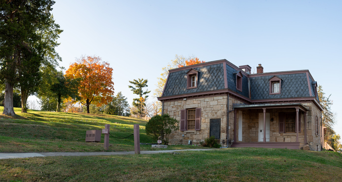View of Superintendent's Lodge in Fredericksburg National Cemetery on sunny fall day.