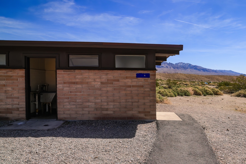 Mesquite Springs Campground Women's Restroom. An asphalt path leads to the entrance of the restroom. The surrounding area is gravel. The parking area in front of the restroom appears to be gravel as well.