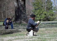 Two men wearing Confederate uniforms, both kneeling, the man in the foreground uses his pinky finger to the push a ramrod back into place while the second made in the background watches.