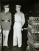 Black and white photograph of two men in military uniform standing by crates of metal objects.