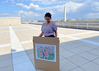 Latino Heritage Internship Program 2022 intern Leslie Garcia holding a picture of her painting of flowers.