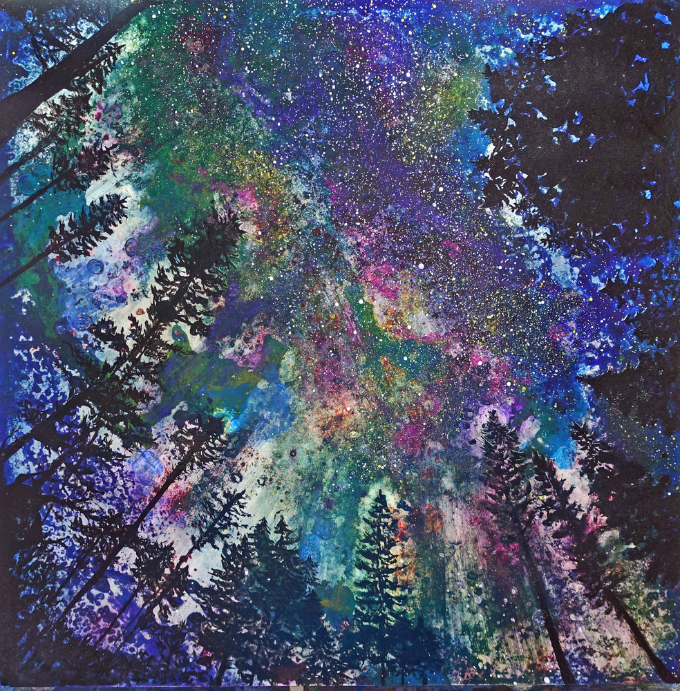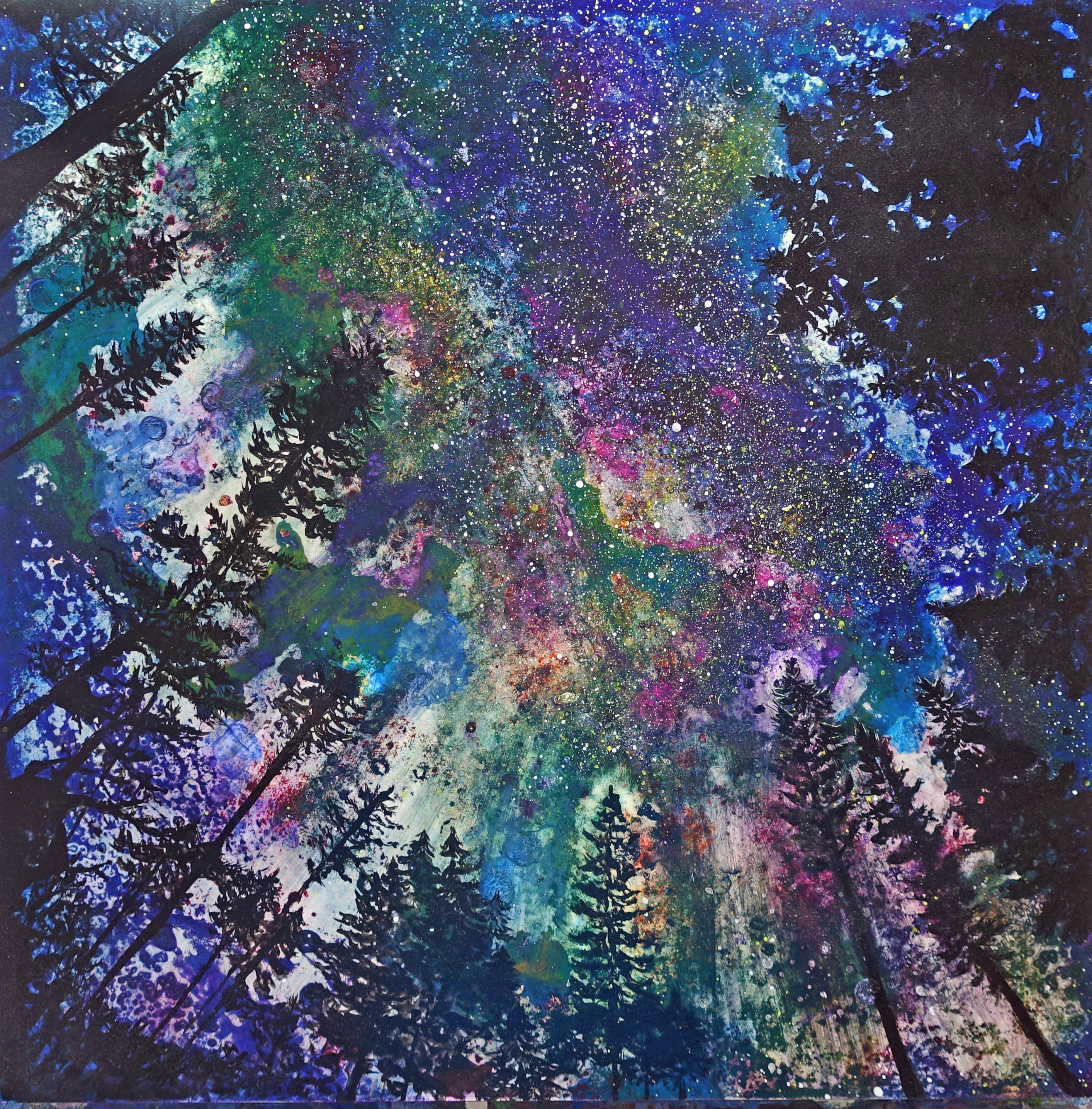 Mixed Media of night scene, looking up through a break in Pine Trees at a "bejeweled" sky.