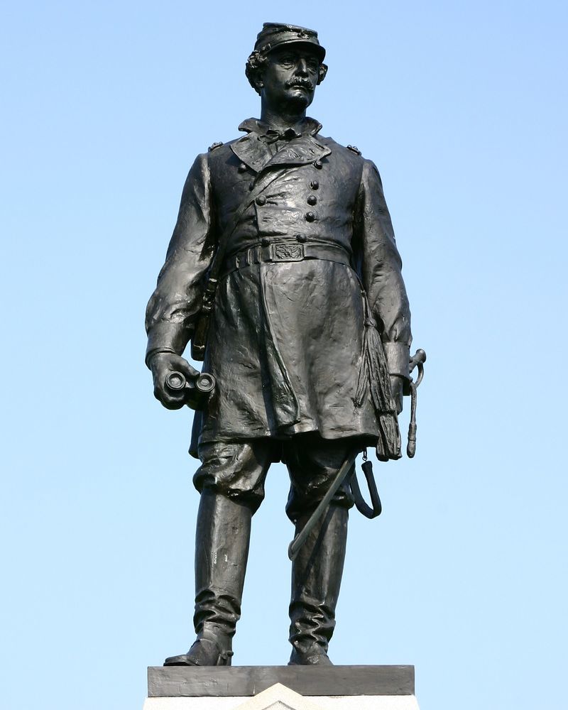 Commemorates the services of Major General Abner Doubleday during Gettysburg Campaign. Placed in approx. center of his Division line on July 1, 1863, prior to retreat to seminary. Located on McPherson Ridge, Reynolds Ave near junction w/ Meredith Ave || Bronze standing statue, 9' high. Pedestal 11'6" square, 11' high. Bronze tondo bearing New York State coat of arms on S face of pedistal. Bronze inscription tablet on W face of pedistal.