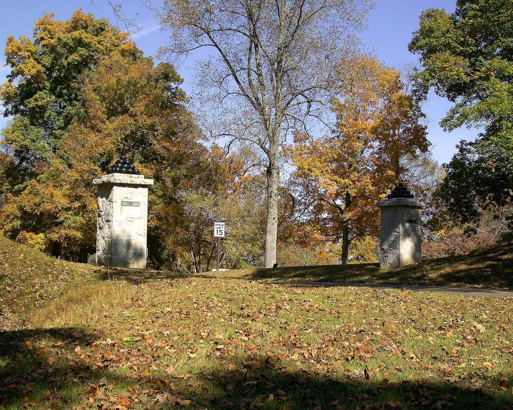 Fort Donelson Entrance consists of two, 3'-7" square, 10'-7" tall limestone piers that flank the Fort Donelson Park Road. Piers feature a limestone cornice, cannon ball stack, and bronze plaques that read "Fort" and "Donelson". The entrance is part of designed landscape laid out by the War Department between 1928-1933. || Fort Donelson Entrance is significant at the local under NR Criterion C as part of designed landscape laid out by the War Department between 1928-1933.