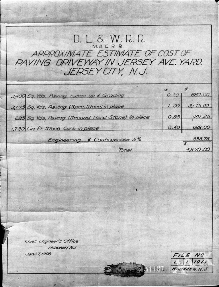 51137.BA#001--Approximate estimate of cost of paving driveway--Jersey Avenue Yard--Jersey City, NJ [1908.01.27]