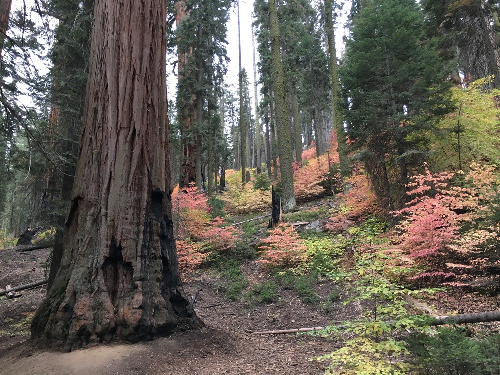 Tree leaves turn yellow and red with the coming of autumn in a sequoia grove.