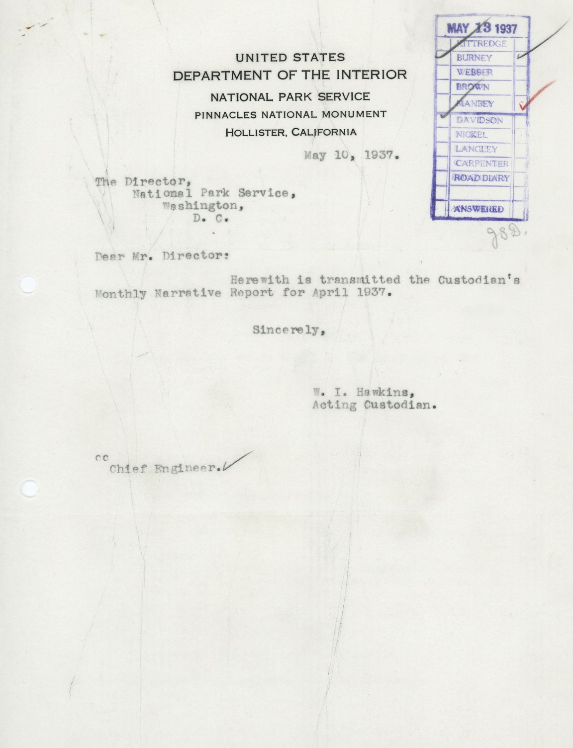 Pinnacles National Monument Custodian W.I. Hawkins' correspondence about Superintendent's Narrative Report.