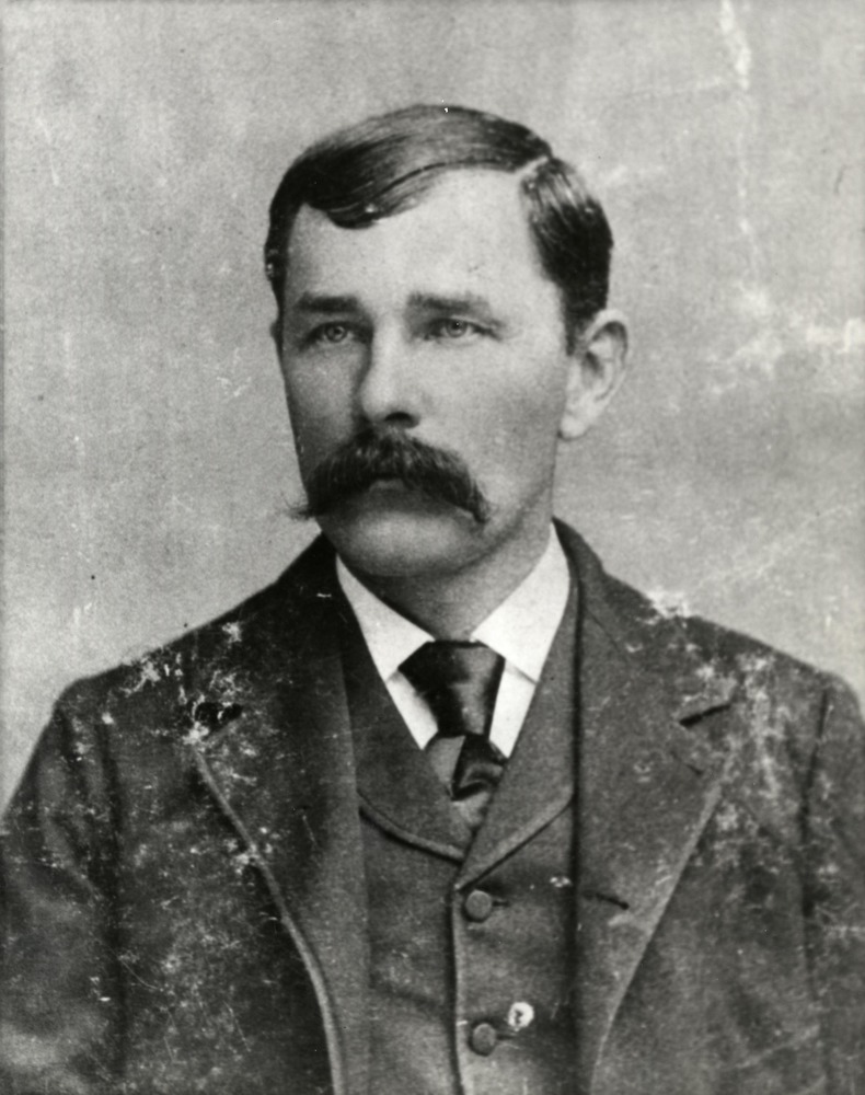 A white man with a thick mustache wearing a dark three piece suit and necktie.