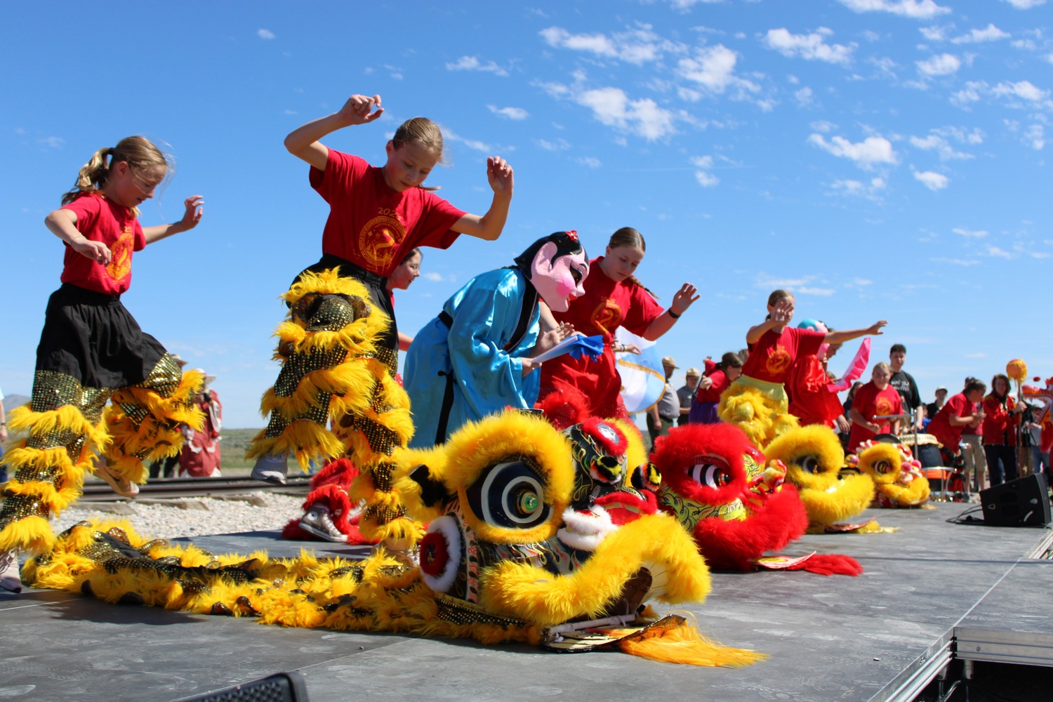 Chinese Orange, Red Lion costumes on stage. With Kid Actors dancing.