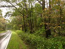 A curve of wet road, grassy, green shoulder and edge, then dense forest of greens, yellows, and brown