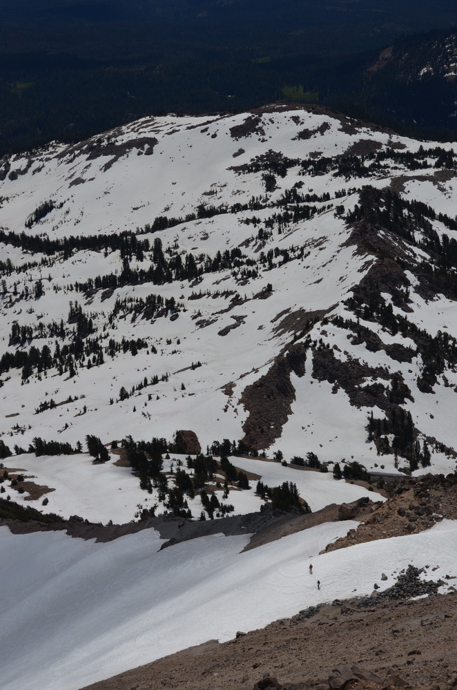 Two hikers cross a snow-covered switchback below the "belly button" of Lassen Peak.