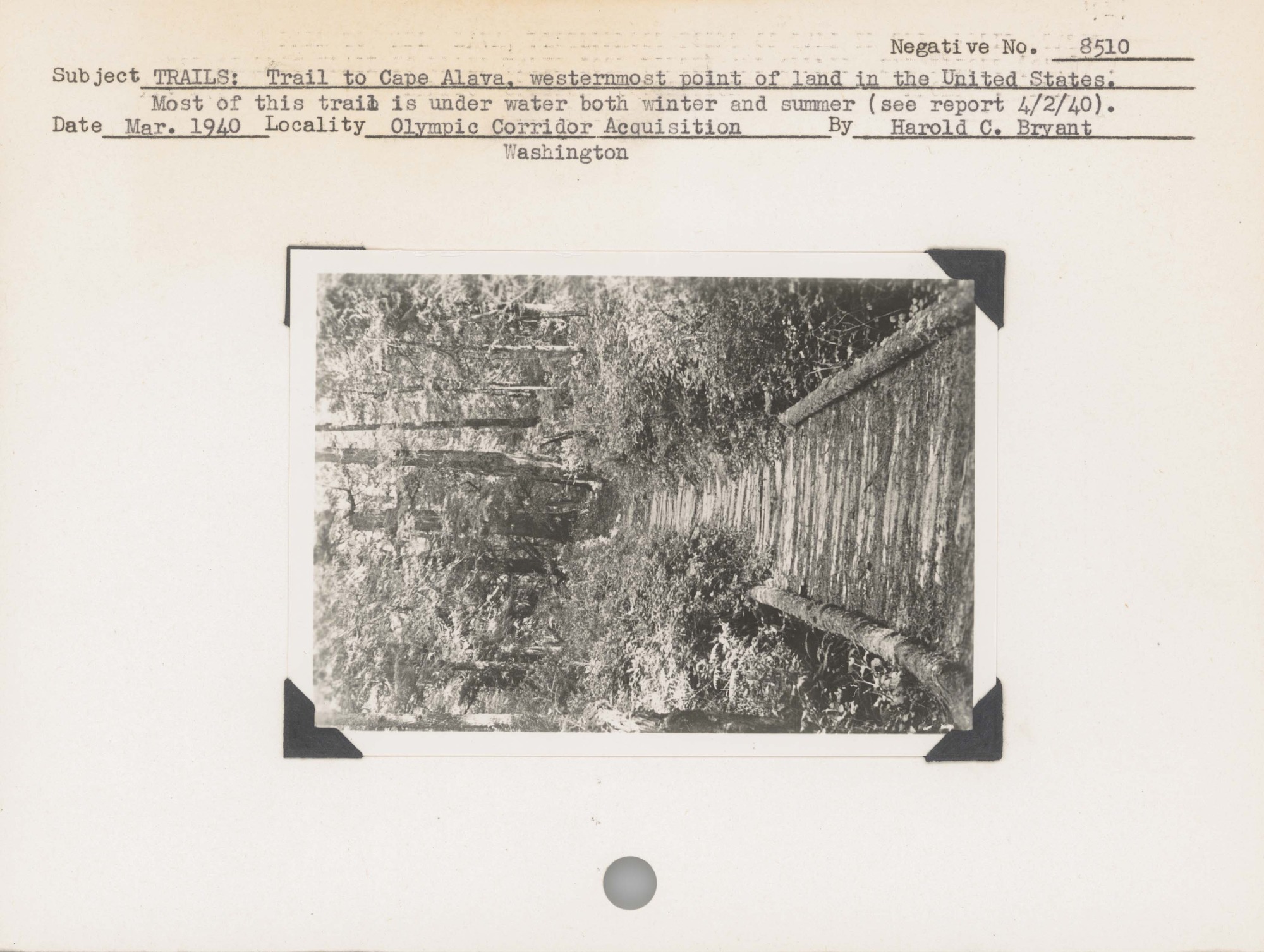 Scenery: Trail to Cape Alava, westernmost point of land in the United States. Most of this trail is under water both winter and summer (see report 4/2/40). Negative #: 8510. Location: Olympic Corridor Acquisition, Washington.