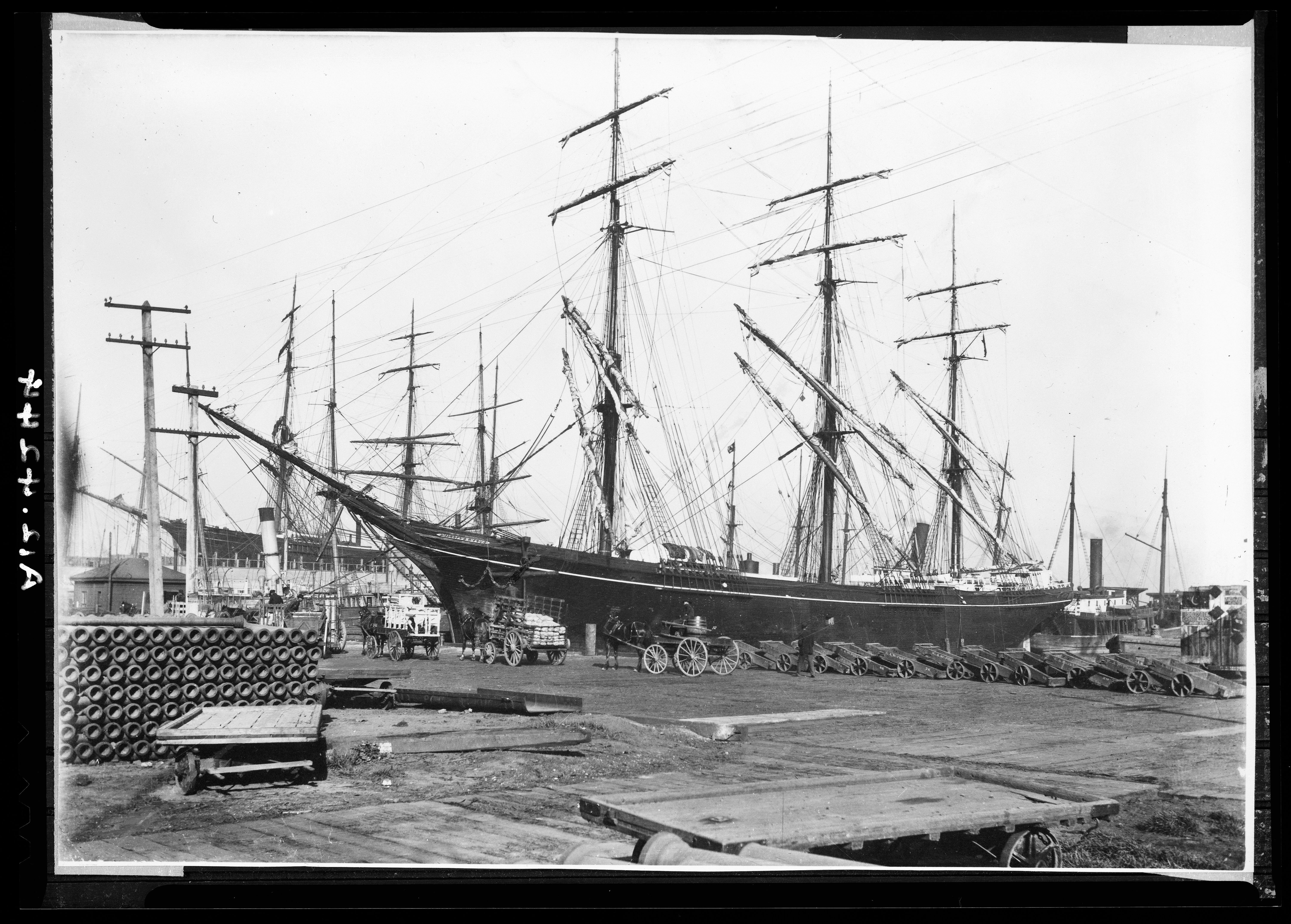 Image reproduced in John Kemble's book, "San Francisco Bay: A Pictorial Maritime History," p. 125, with the following information: "WILLIAM H. MACY, which is shown unloading at a San Francisco pier, was built in 1883. At the time this picture was taken, she was owned by Eschen and Minor of San Francisco, but she was still on the Cape Horn route. She ended her days in coastwise coal and lumber service." Note on the small enclosure says, "In 1906, she was owned by Carleton, Norwood, of San Francisco."