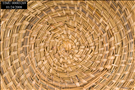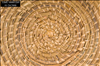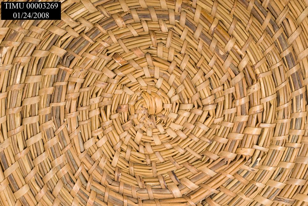 Lg, circ basket made using bundle of pinestraw wound in coil. The bot portion of<CRbasket is flat & consists of 21 concentric circles. Sides of basket wound perpend to the b<CRott part & consist of 6 circ. Bundle & coil fastened togeth w/strips of caining altern w/<CRea circle. Exter bott of bask has a 2nd bundle pinest fasten ard perimeter to form lip. Ge<CRn 1st impress.is that sides are straight up & down, tho actually top slightly wider than<CRbase. Bask gen good cond tho some of caining is loose or missing.