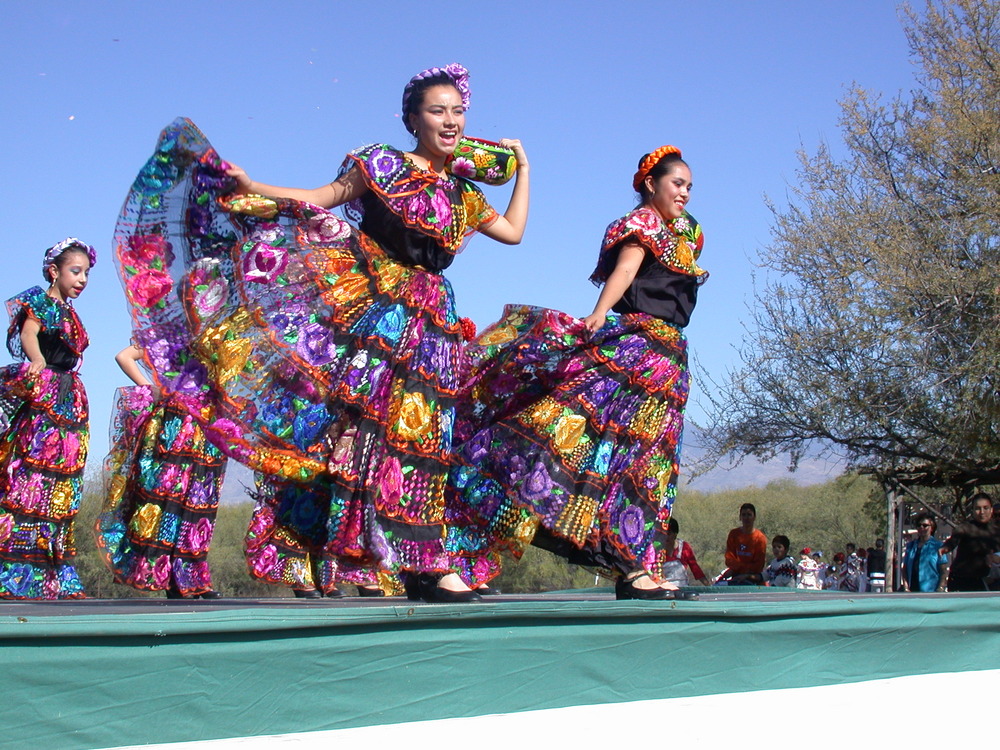 Folklórico dancers at La Fiesta de Tumacácori, women in colorful dressed with pots held on their shoulders