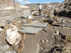 A park employee inspects the broken pavement of a road damaged by floodwaters.