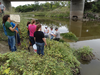 Volunteers hold nets standing on the side of the river. Bridge in background.