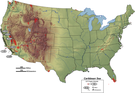 Shaded relief map of United States, highlighting National Park Service sites at Transform Plate Boundaries.