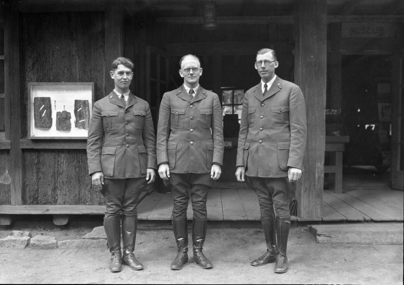 NPS Groups, Naturalist Staff, L to R: Powell, Been, Van Deest at Giant Forest Museum.