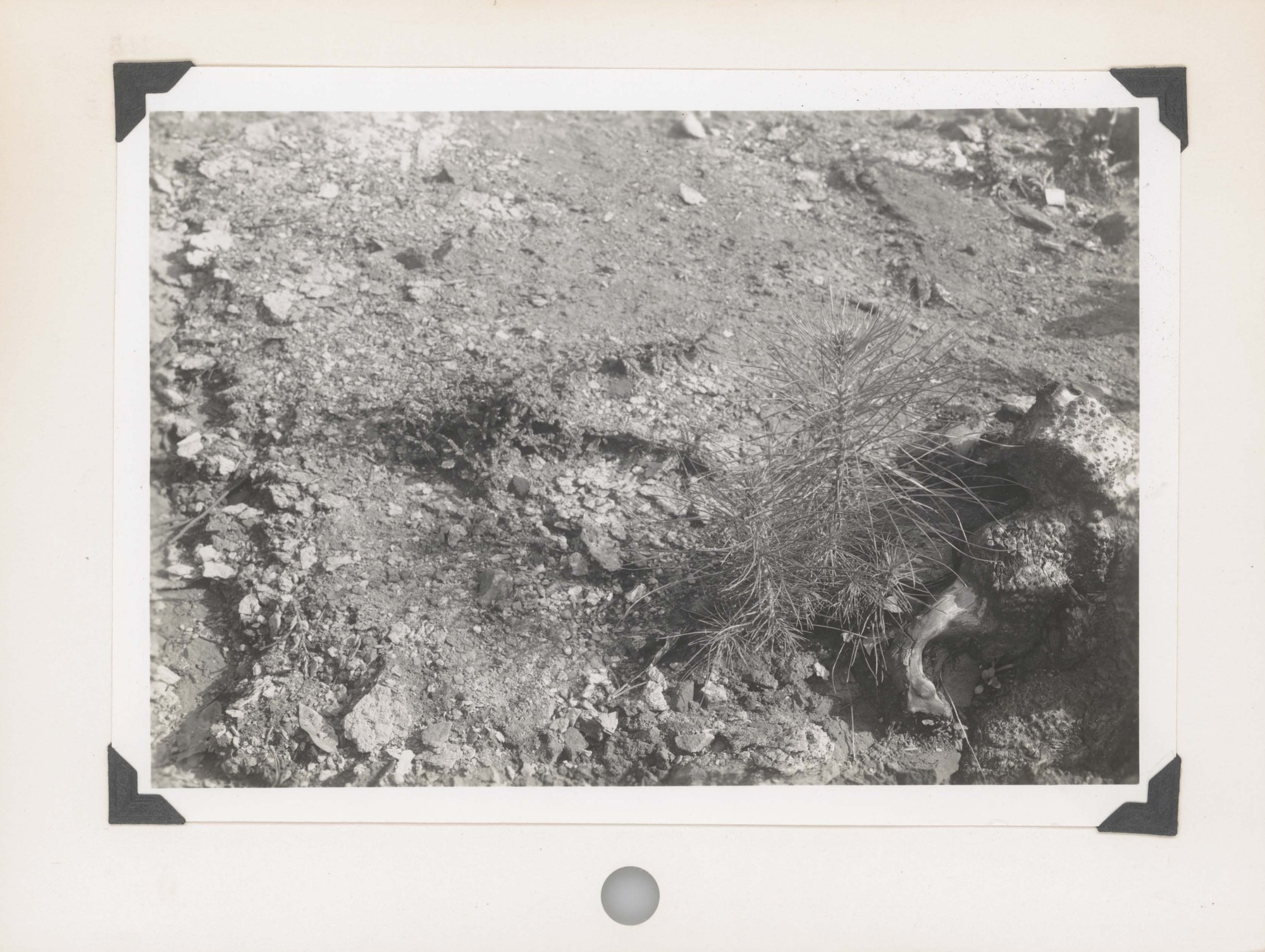 Forest Fire: Two Knob-cone pine seedlings 8 inches high plus Ceanothus seedling 3 inches high. Negative #: 9444. Locality: Big Basin State Park, California. [This information comes from the reverse of the print for this negative number.].