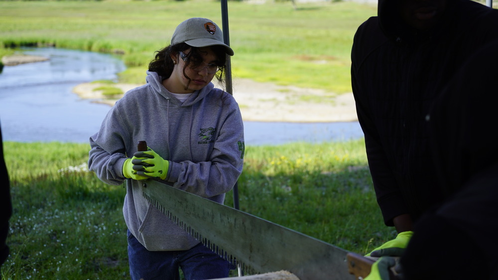 SCA intern Ella using a crosscut saw to cut a log in half.