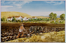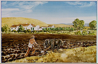 Marcus Whitman walking behind an oxen pulled plow in a field outside the Whitman Mission.
