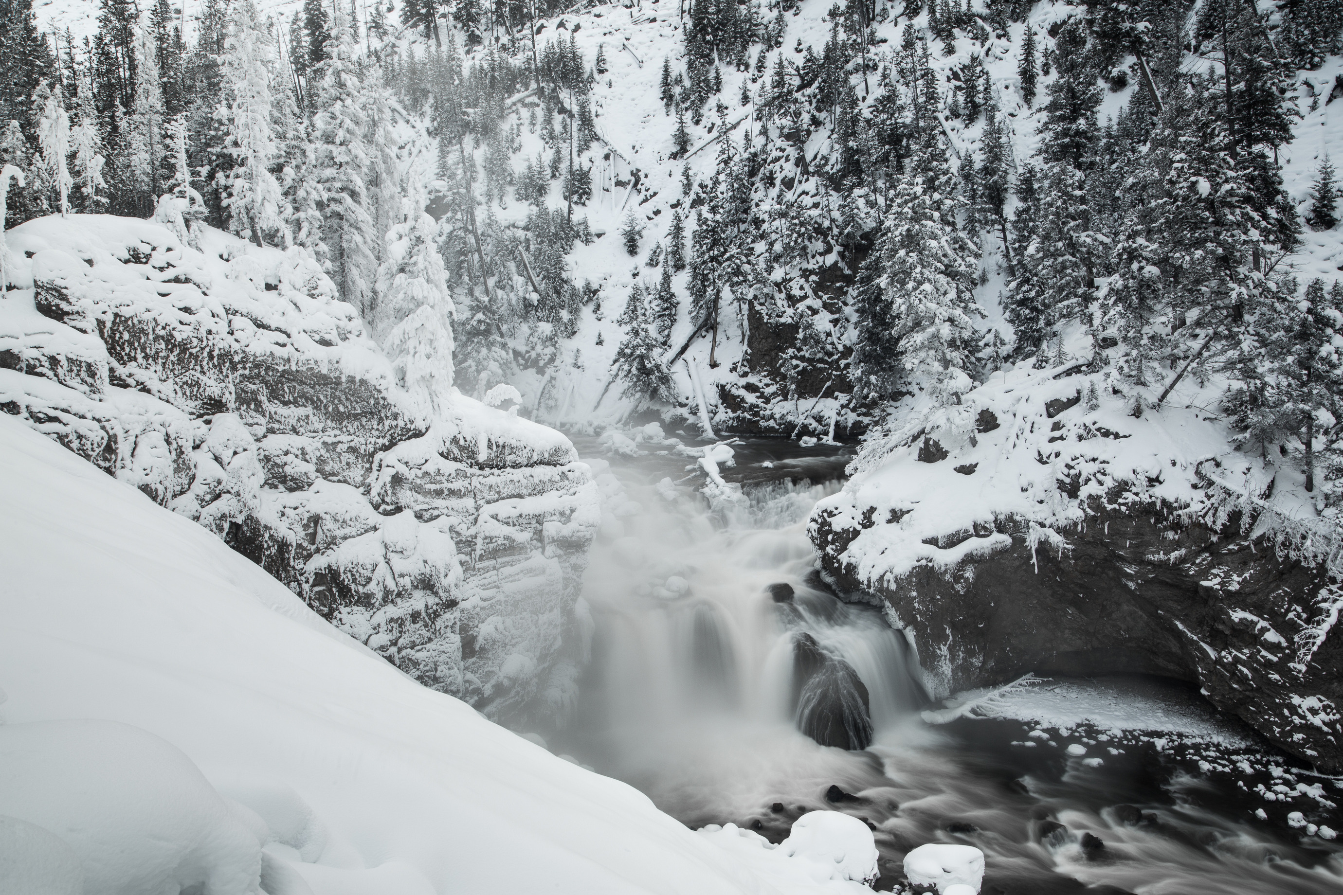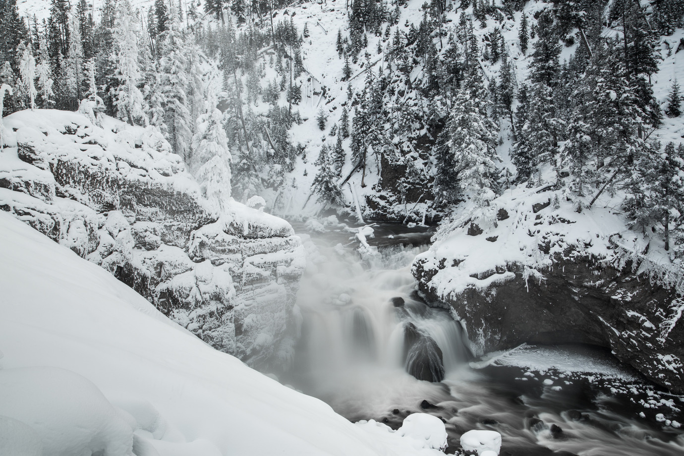 A waterfall flows between two rocky rims in winter with snow all around it.