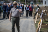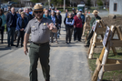 A man in ranger uniform points in front of him as he speaks. A group of people follow behind him.