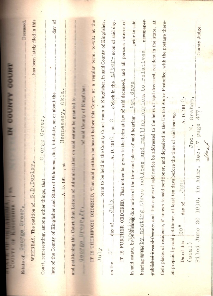WHEREAS, The petition of S.D.Dooley, has been lately filed in this Court, representing, among other things, that George Greer, late of the County of Kingfisher and State of Oklahoma, died, intestate, on or about the [blank] day of [blank] A.A. 191[blank], at Hennessey, Okla.