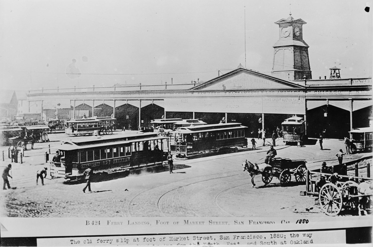 At the foot of Market Street. Note the street railway cars. B424 Ferry Landing, Foot of Market Street, San Francisco, Cal. 1880[CR]The old ferry ship at foot of Market Street, San Francisco, 1880; the way