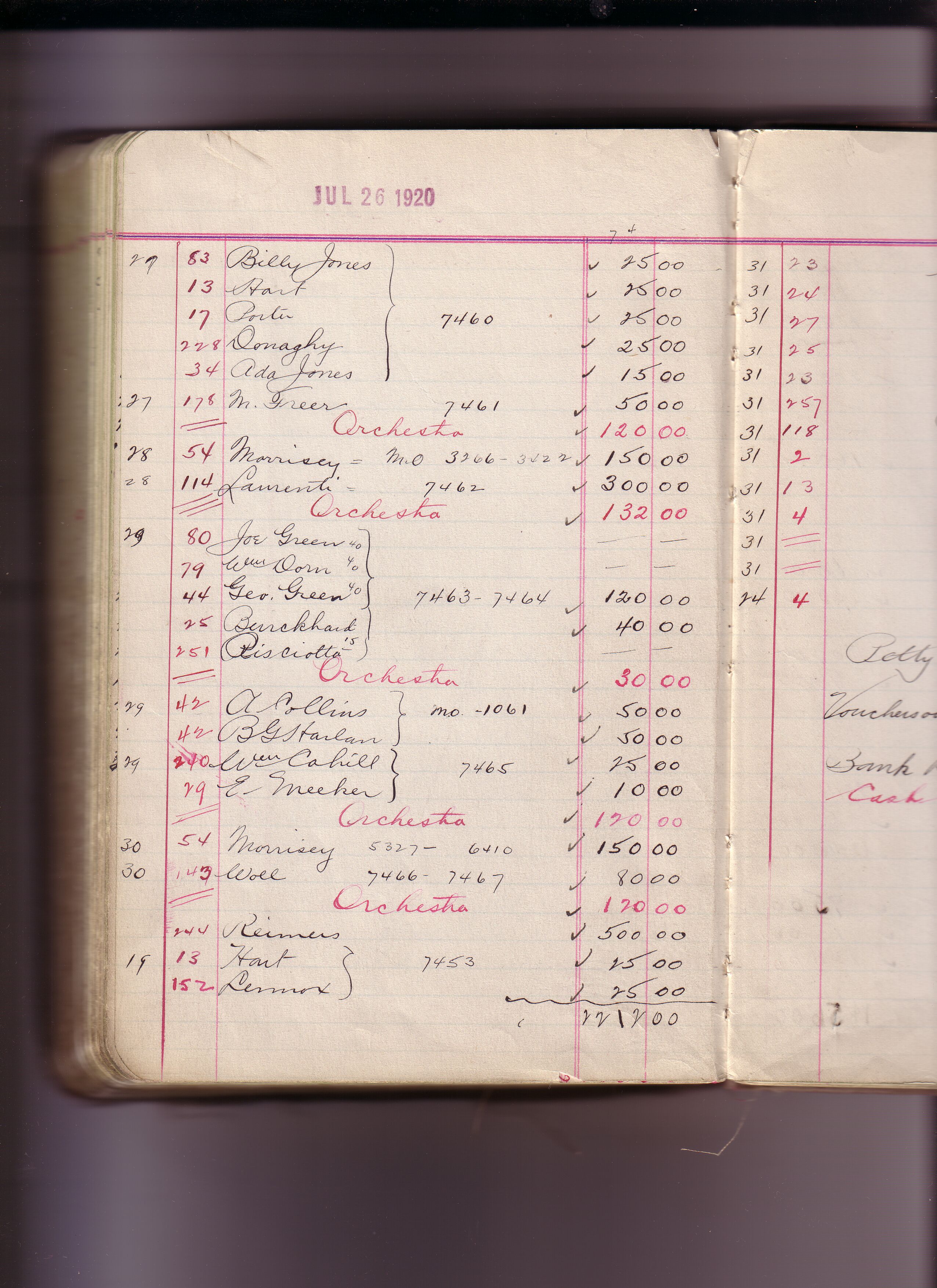 Thomas Edison's New York City Recording Studio Cash Book 16 (of 21), Image 262 (of 305). (Notebook #: PN-18-05-01, NPS catalog #: EDIS 1427), This book documents Diamond Disc matrices 6147 – 7712, expenditures for recording artist fees and other payments authorized by studio manager Walter H. Miller from May 01, 1918 – December 27, 1920. Digitally scanned December 2004 through July 2005 at resolution 300 dpi, 24 bit.